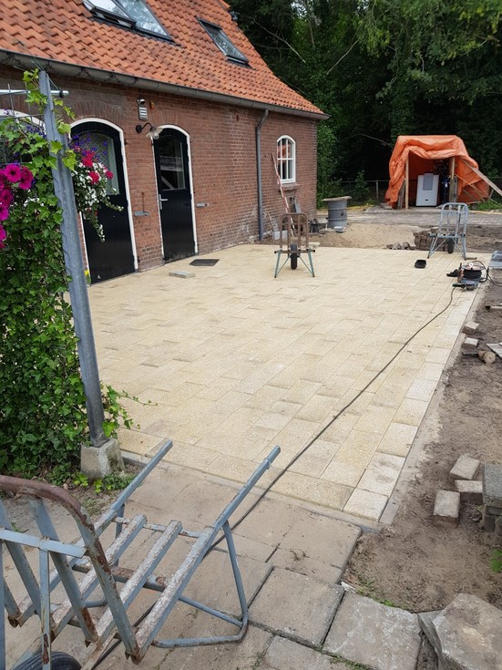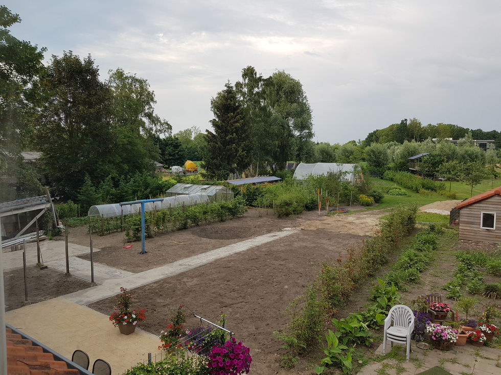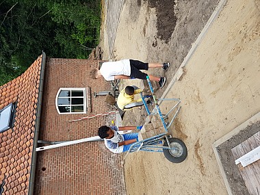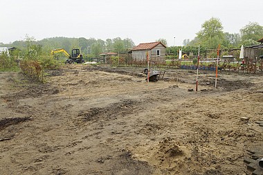 In de Woonboerderij wonen kinderen die niet of tijdelijk niet thuis kunnen wonen. “De Woonboerderij is klaar, maar er moet nog een heleboel omheen gebeuren. De inrichting van de tuin met alles wat erbij komt kijken is een ideaal praktijkproject.” Frank is een allesdoener die uit opleiding en ervaring de in de tuin voorkomende werkzaamheden kent. Om te beginnen hebben ze de indeling van de tuin uit moeten zetten aan de hand van een tekening. Waar komt de stoep, de pad, welke deel wordt verhard en waar komen nog opstallen. De moestuin die de bewoners van de Woonboerderij van verse groente en fruit voorziet moet opnieuw en dan professioneel aangelegd worden. Dierenverzorgers in spe kunnen hier veel leren, want er loopt nogal wat vee rond.